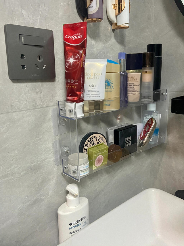 卫生间台面变得整洁清爽,化妆品摆放有序,拿取便捷。