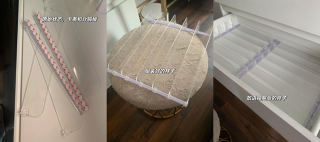 根据抽屉或柜子内部的长、宽、高尺寸选择合适卡条尺寸和隔板尺寸的分隔板。