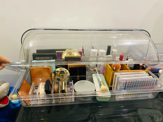 有了透明食品盒,化妆品一目了然,再也不用为找一支口红而翻得乱七八糟。