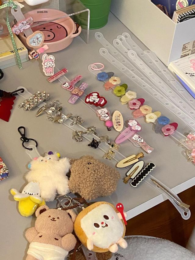 把各种挂件、发夹等依次挂在挂条的挂钩或锁扣上,按照种类或者颜色进行排列,方便寻找。