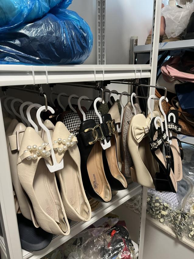 固定好轨道后,将平底鞋一双双整齐地用架子挂起放在轨道上。