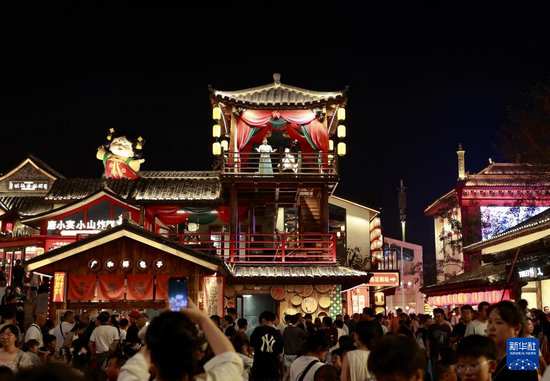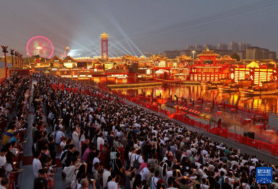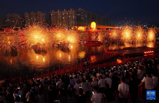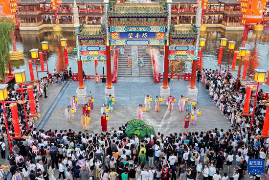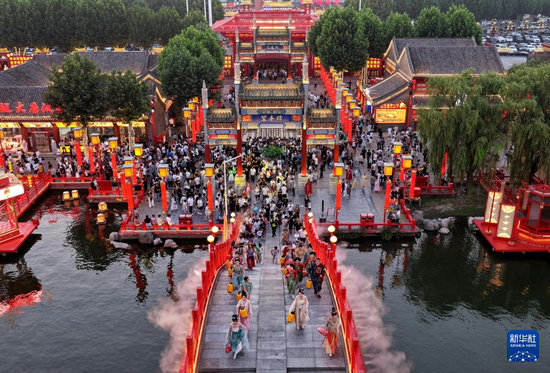 7月21日,游客在河北省唐山市丰南区河头老街景区欣赏文艺节目(无人机照片)。